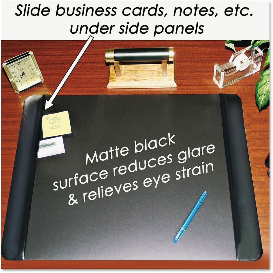 Executive desk pad protects your desktop from scratches, stains and spills and cleans with ease. Microban antimicrobial product protection works 24/7 and never washes off or wears away. Design also features leatherlike cushioned side panels and a center, firm writing surface that resists stains and cleans with water. Slide notes and business cards under side panels to keep them in place. The ergonomic surface enables smoother writing. Matte black reduces eyestrain. Nonslip foam back keeps desk mat in place. |
