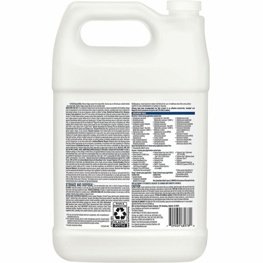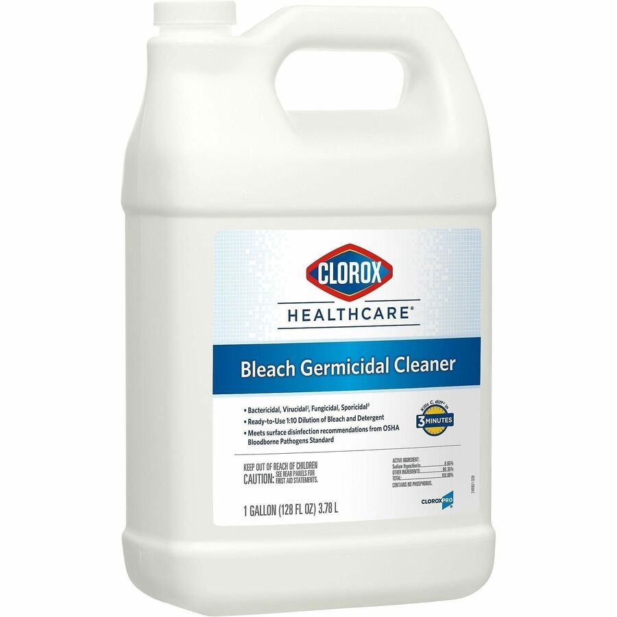 | Marketing Information | Your proven bleach solution for cleaning, Clorox Healthcare Bleach Germicidal Cleaner kills C. difficile and C. auris in 3 minutes and more than 50 other microorganisms in 1 minute or less, including outbreak-causing viruses, emerging viral pathogens, MRSA and VRE, when used as directed. A precleaning step is required to kill Clostridioides difficile and Candida auris. Compatible with common healthcare surfaces including plastics and stainless steel, this versatile hospital cleaner is even recommended in medical equipment cleaning and care guides. Use in healthcare settings including hospitals, medical facilities, outpatient facilities and long-term care facilities. This refill bottle is intended for use with the Clorox Healthcare Bleach Germicidal Cleaner Spray (not included). |