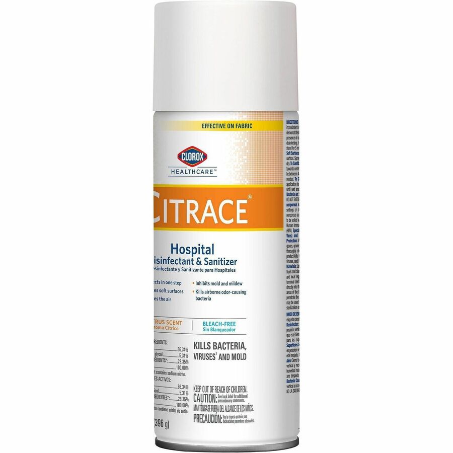 | Marketing Information | Healthcare Citrace Hospital Disinfectant and Deodorizer kills microorganisms on soft surfaces, hard surfaces and more. It kills 99.9 percent of bacteria on soft surfaces in just 30 seconds. To help prevent the spread of pathogens that can contribute to healthcare-associated infections, regularly spray this disinfectant on fabric or upholstered surfaces including privacy curtains, upholstered furniture, cushions, lab coats and linens. EPA-registered disinfectant kills 24 microorganisms on hard surfaces in 5 minutes. Simply spray and let air dry on equipment such as light switches, telephone receivers, remote controls, wheelchairs, empty wastebaskets, supply carts and bathroom basins. With a fresh citrus scent, Citrace eliminates odors from the air instantly by killing the bacteria that causes them. Its light citrus scent disappears rapidly to leave areas smelling fresh and clean It is intended for use in commercial settings. |