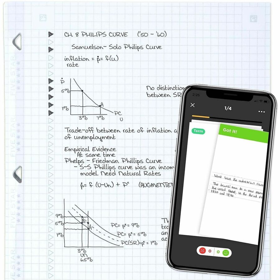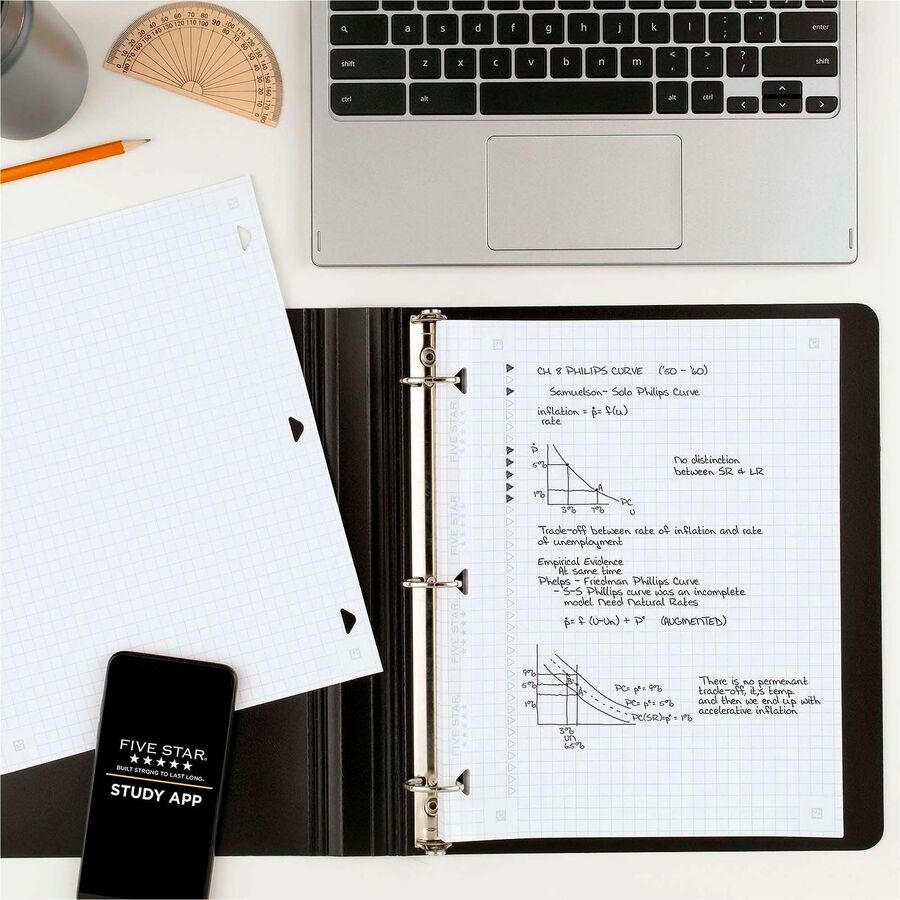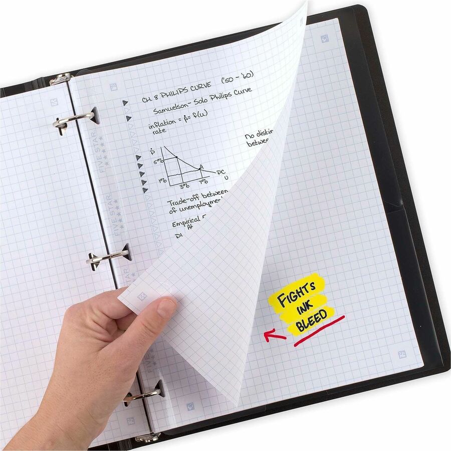 | Marketing Information | Reinforced Graph-Ruled Filler Paper is double the strength with durable, triangle-shape holes and strong reinforcement tape that resists tearing. Patented, triangular holes are more durable and turn easily along binder rings. SFI-certified, heavyweight paper keeps up with all your projects and fights ink bleed, maximizing both sides of the page for note-taking space. Loose-leaf, graph-ruled sheets feature 4 squares per inch for graphing, charting and engineering projects. Scan, study and organize notes with the Five Star app. Create instant flash cards and sync your notes to Google Drive to access them from anywhere on any device. |
