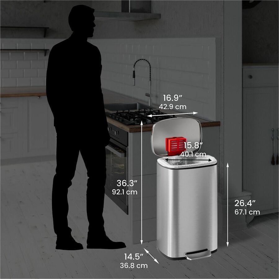 | Marketing Information | Fire-rated, FM-approved, Soft Step Trash Can provides the compliance, protection and style you want in your facilities. Bin fires are quickly extinguished with the special, fire-retardant liner material and a tight lid design that restricts airflow to the interior, starving the flame of oxygen. Smooth, easy pedal operation opens and closes the lid softly and silently. Removable bucket is easy to empty. Odor filter keeps surrounding area smelling fresh and clean. Carry handle provides effortless mobility. Durable, stainless steel design fits into tight spaces and adds an attractive element to any area. |