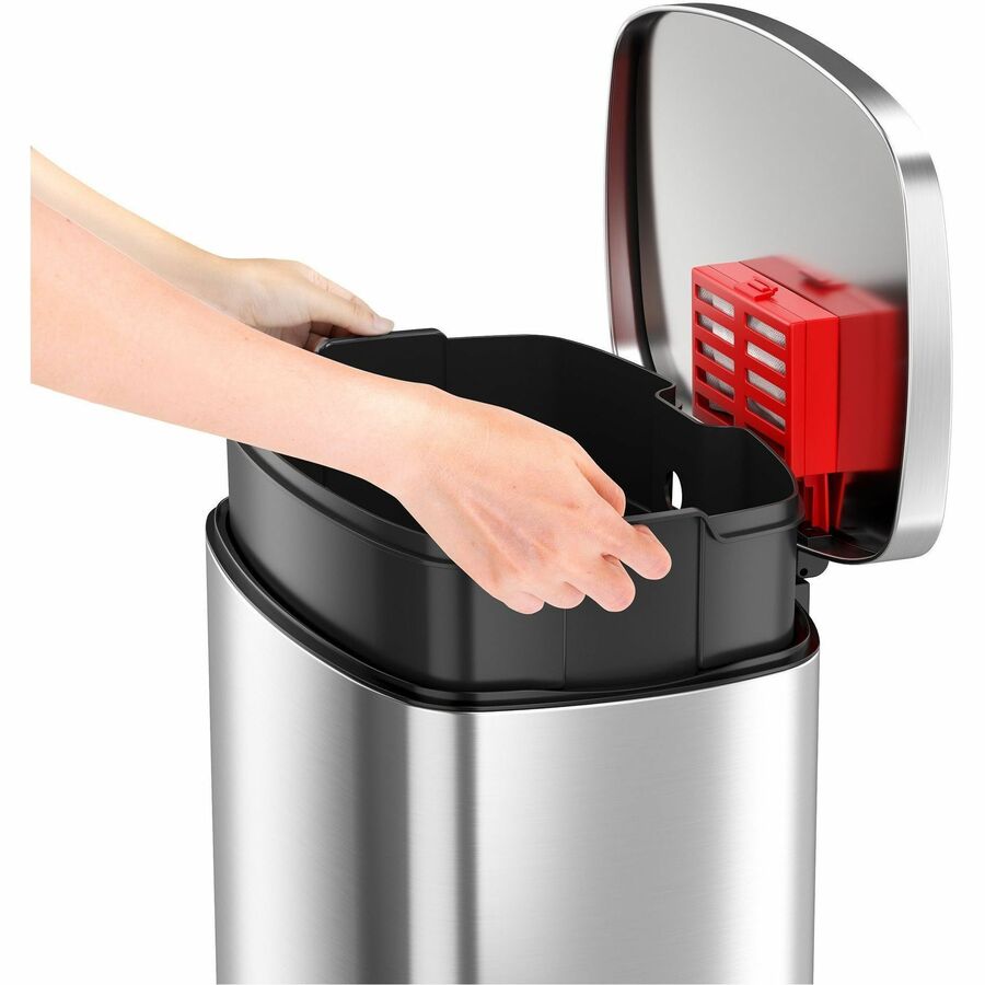 | Marketing Information | 13-Gallon Soft Step Trash Can offers incredibly smooth pedal operation for easy access to the bin. Gentle lid closes silently for a more pleasant experience. Tuck-and-hold retention system holds liners securely in place. Stainless steel body coating is fingerprint-resistant and smudge-resistant to minimize cleanings. Stay-open mode keeps the lid locked open for quick disposal in busy locations. Removable inner bucket allows easy trash disposal and bag replacement as needed. Vertical joint seam is more in the center of the large panel for enhanced structural support. Easy-to-replace air damper means this trash can will provide like-new performance through decades of use. Nonskid rubber feet ensure the can stays securely in place as you push the pedal. Fire-resistant trash can also includes built-in carry handles to let you easily carry this can from room to room. |