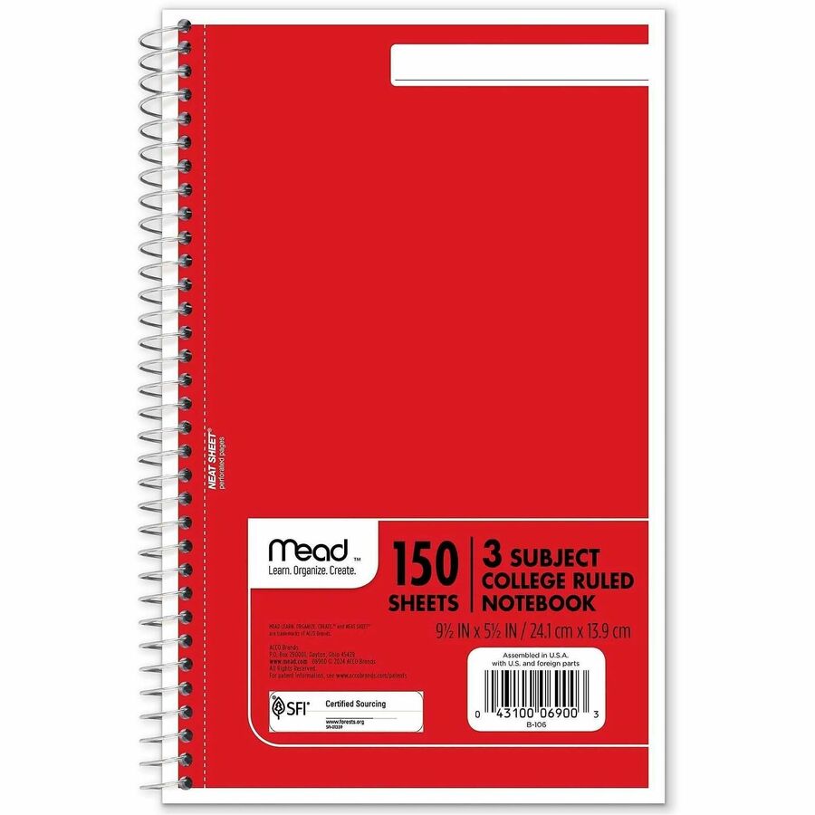 | Marketing Information | Wirebound notebook features three subjects, 150 sheets, a tan board back and heavyweight cover. Each sheet is college-ruled. Assorted cover colors include blue, light blue, green and red, and a random color will be shipped. |