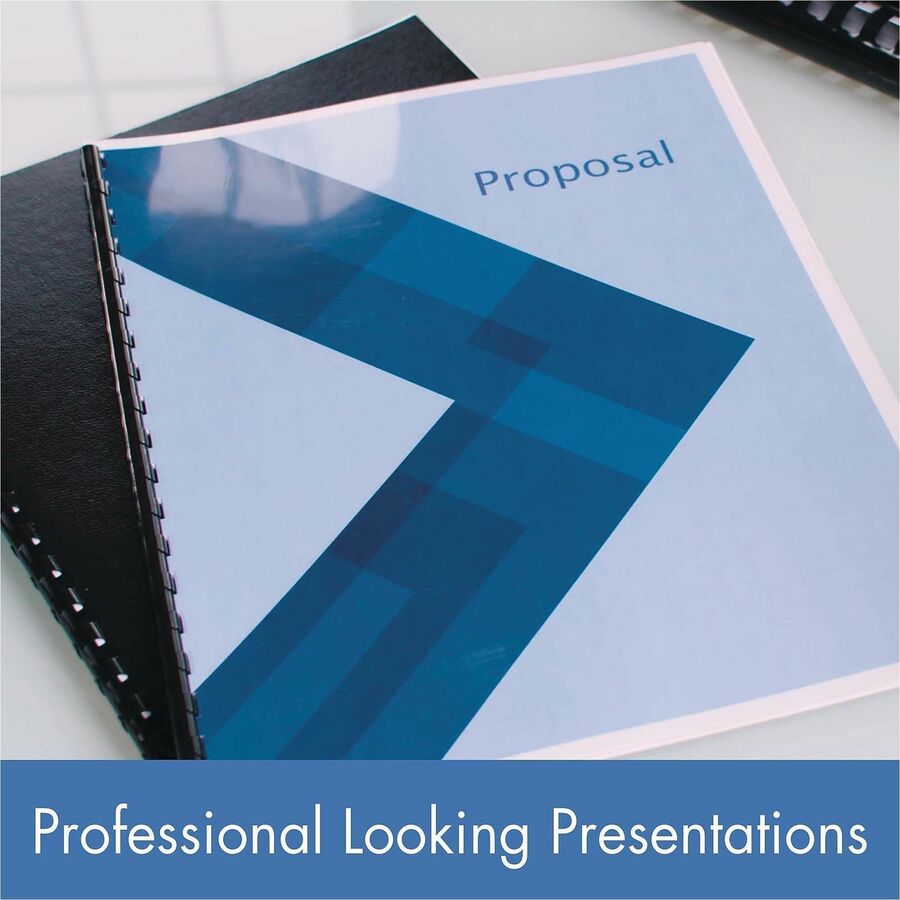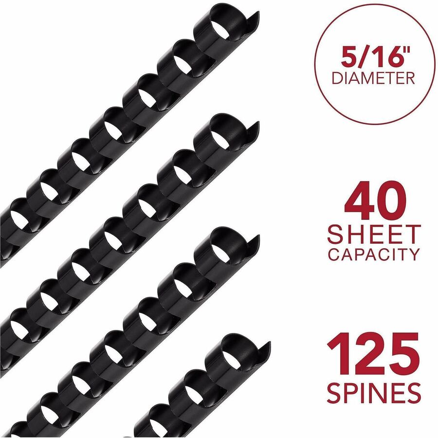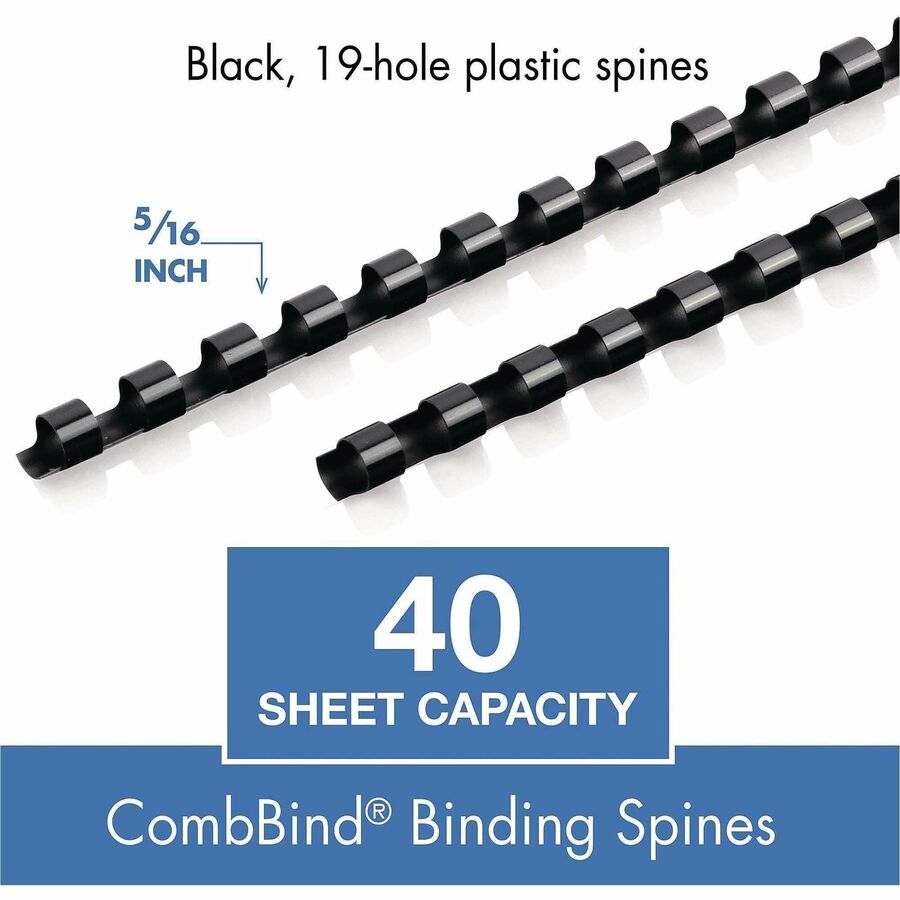 | Marketing Information | Once you have your binding covers picked out, use these binding spines to keep your documents and presentations neatly bound. Durable construction ensures that your finished document is both fully functional and long-lasting. Permanent spines allow your pages to lie flat to keep them manageable and easy-to-read. Sturdy plastic material will not scratch, peel, chip or discolor for lasting durability. 5/16" spine binds up to 40 letter-size sheets. 19-hole binding spines are designed for any comb-style binding machine (sold separately). |