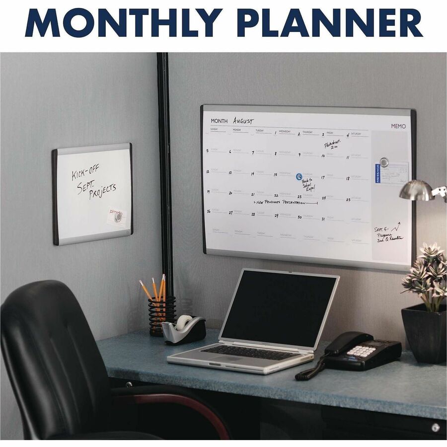 | Marketing Information | Magnetic dry-erase calendar is a versatile planning tool. Undated so you can show and change date by month in ring space. Display key notes and deadlines in memo writing area. Versatile, magnetic dry-erase surface doubles as marker bulletin board. Accommodates any fabric panic wall system, with or without overhead bins. Mount to cubicles or drywall with flexible mounting system. Height-adjustable clips ensure straight and level installation during drywall mounts. |