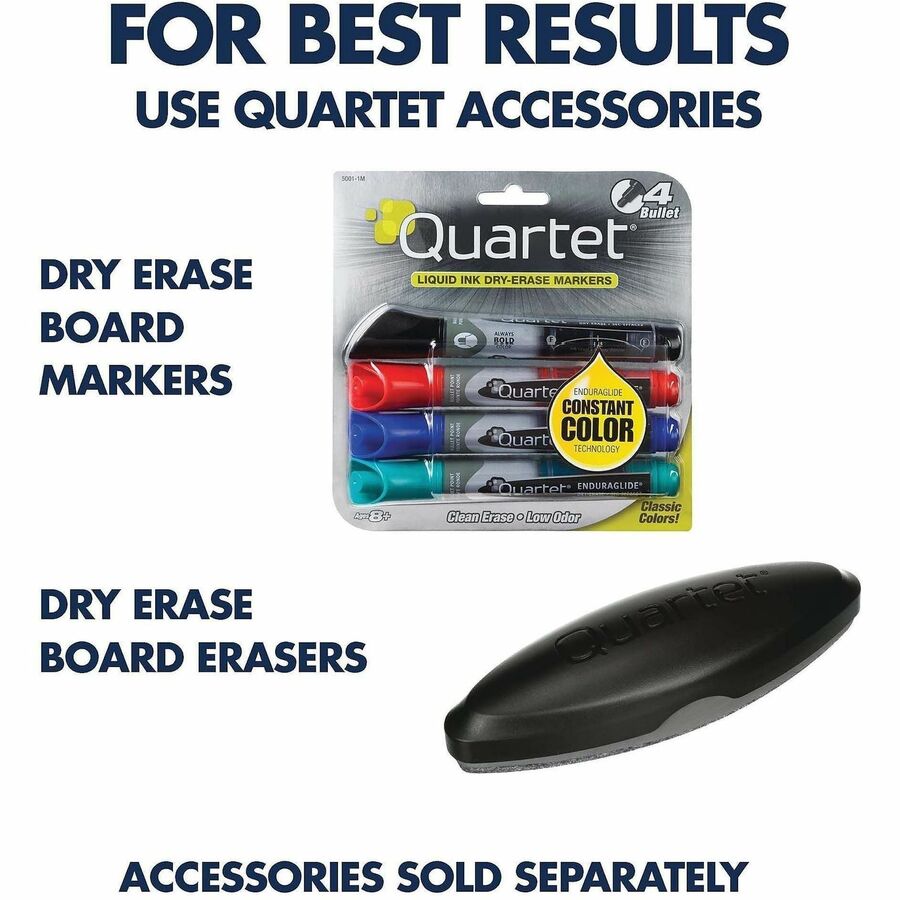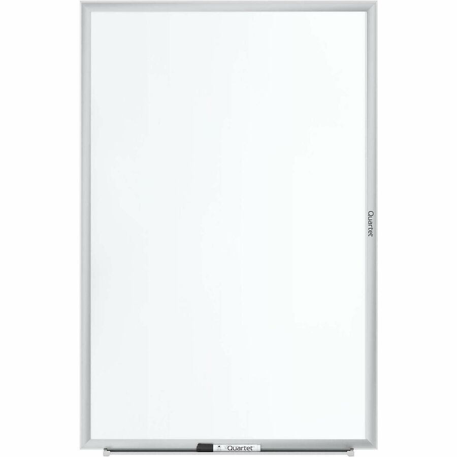 | Marketing Information | Upscale, magnetic dry-erase board offers a smooth, blank writing surface that is ideal for jotting down reminders, collaborating with others and keeping yourself organized. Ideal for moderate use in spaces with regular traffic. Magnetic quality with steel backing allows the surface of the board to double as a whiteboard and magnetic bulletin board. Clearly write messages using dry-erase markers and hang documents on the board using magnets. Silver finish, aluminum frame is sturdy and stylish. Attached marker tray provides convenient storage for accessories. Board also includes one dry-erase marker with a chisel tip and easy-to-use hardware for wall-mounting. To extend the life span of the board, clean the surface regularly with Quartet cleaning solutions. |