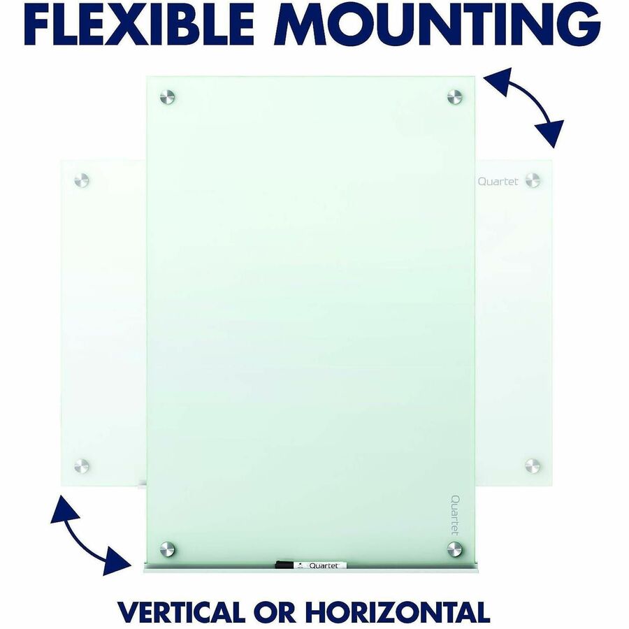 | Marketing Information | Ideal for heavy use in spaces with moderate traffic, this glass marker board provides long-term durability with a modern aesthetic appeal. Tempered glass surface will not stain, ghost, scratch or dent despite heavy use. The magnetic feature allows instant hanging of documents and notes. White-colored glass board surface clearly displays any color dry-erase ink. Your dry-erase markers glide evenly over the board surface for smooth writing. Nonabsorbent glass is easy to keep clean with Quartet whiteboard cleaning supplies (sold separately). Frameless board is easy to install with included pass-through mounting hardware. Hang vertically or horizontally. Board includes one dry-erase marker and two rare-earth, high-power magnets. |