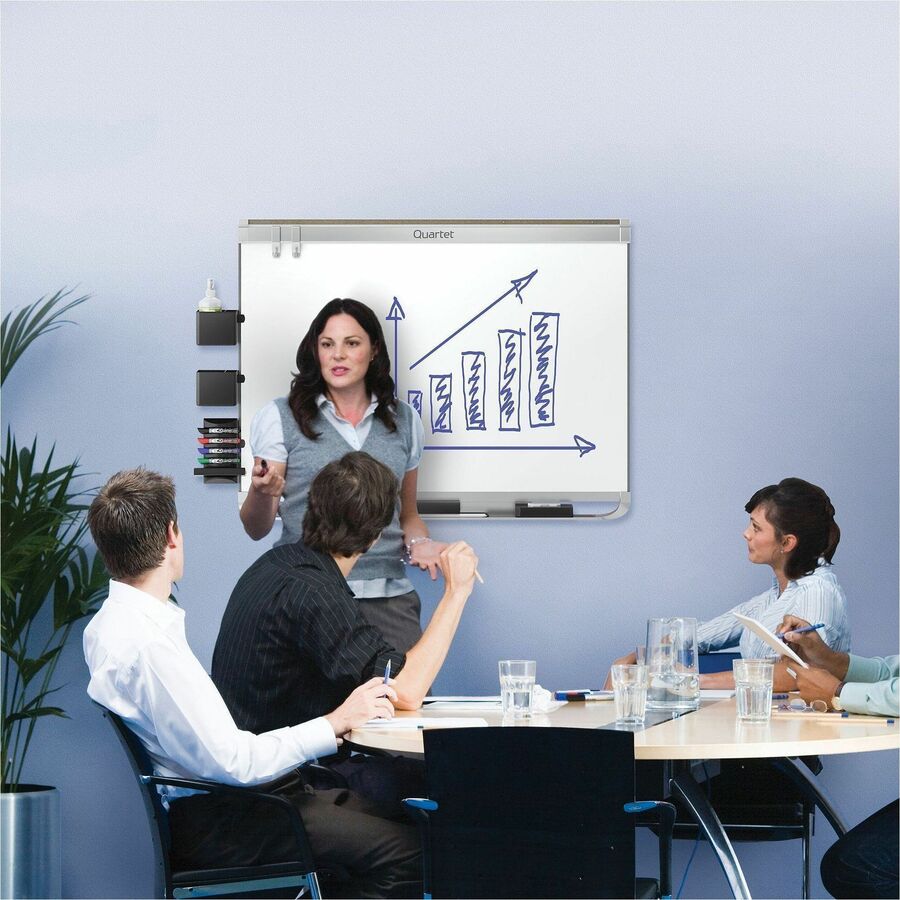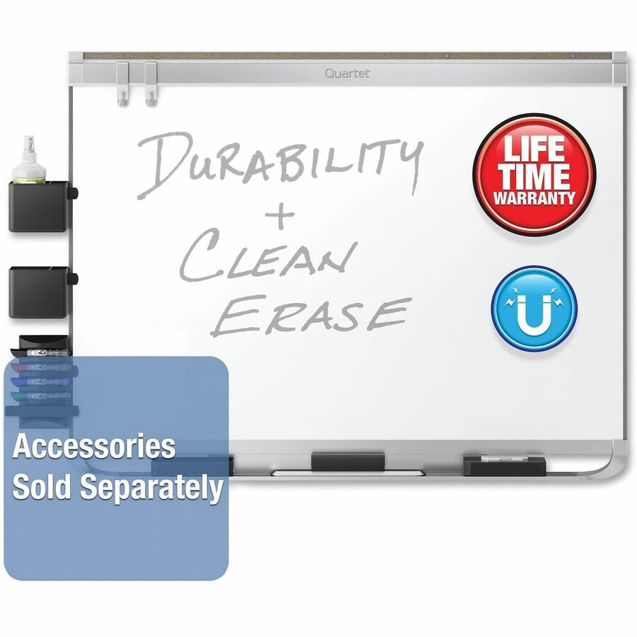 | Marketing Information | Prestige 2 DuraMax porcelain board features Quartet's most durable writing surface. Exceptionally resilient and smooth, the porcelain surface will not ghost, stain, scratch or dent over time despite years of heavy use. The surface of this whiteboard is also magnetic so that it can double as a magnetic bulletin board. With a stylish aluminum frame and attached marker tray, this top-of-the-line board is a useful addition to any office space. Hang board quickly and easily on any wall using the included pass-through mounting hardware. Sleek, silver-colored frame complements any office environment and is made of aluminum. Whiteboard also features a full-length marker tray that is specially designed to securely hold accessories. Prestige Connects accessories (sold separately) quickly and easily attach to the specialized frame to provide convenient access to board essentials. Minimal cleaning of board surface is recommended. Board includes four Quartet dry-erase markers with chisel tips. |