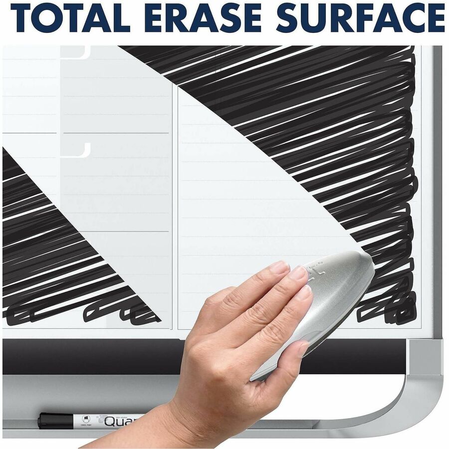 | Marketing Information | Keep important project dates highly visible with the Prestige Total Erase Monthly Calendar. Ideal for hard walls in frequently used group or personnel environments. Total Erase surface will not stain or ghost and resists dents and scratches, allowing new months to begin with a clean slate. Effectively display information in the generous notes area and date entry space. Undated calendar offers seven columns labeled Sunday through Saturday with the weekends shaded. Patented "Easy Mount" hanging system ensures simple and accurate installation. Calendar includes an attachable marker tray and one Quartet dry-erase marker. Contemporary, graphite finish frame makes a bold impact. |