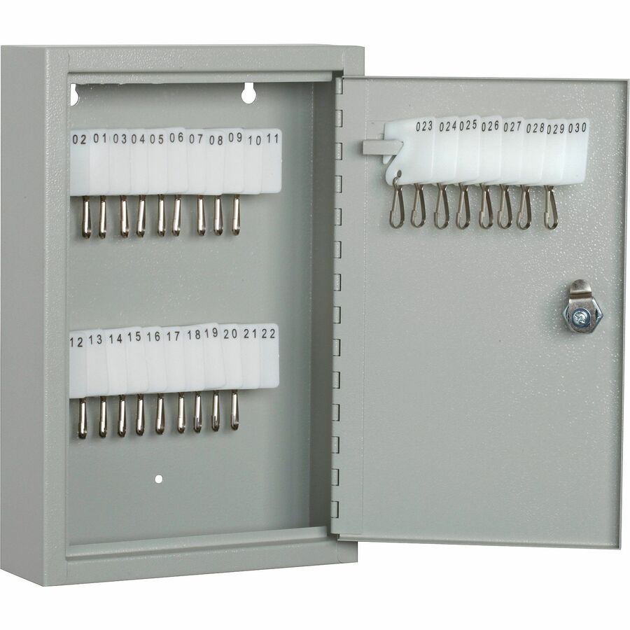 30-key cabinet features a numbered tag system to help you easily manage and organize keys. Heavy-gauge, rolled formed steel and a cylinder keylock keep everything inside safely protected from unauthorized access. Baked enamel, scratch-resistant finish protects from corrosion for long-lasting use in any setting. Door-length hinge design allows it to open completely to easily reach any key to prevent you from accidentally unhooking any surrounding keys. Key cabinet includes plastic key tags, log sheets and mounting hardware. |