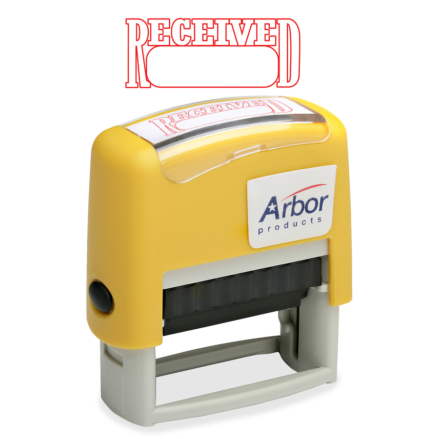 Pre-inked, re-inkable stamp features the eye-catching message, "received," on the top and delivers 50,000 red impressions with no ink pad. Retractable frame keeps stamp surface away from desktop until ready to use. Impression size is 1/2" x 1-5/8". |