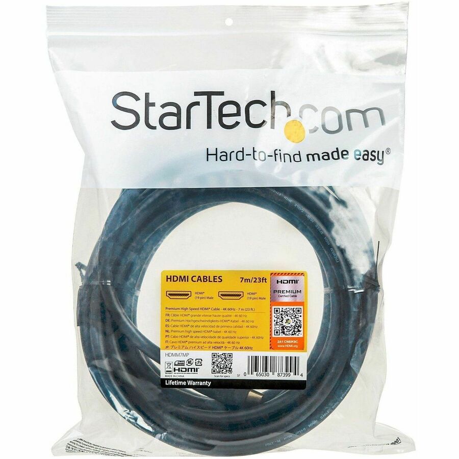 This 7-meterHigh SpeedHDMI® cable has been tested in accordance with the Premium HDMI Cable Certification Program. This ensures it's able to deliver the newest technical features that the latest HDMI specifications have tooffer, including enhanced resolutionsand protection against EMI interference. Each of our certified PremiumHigh SpeedHDMI Cables is labeled with unique anti-counterfeiting authentication, so you can be confident that you have received agenuinecertified cable. Experience the latest that HDMI has to offer The cable supports resolutions of up to 4K@60Hz(3840x2160p) and bandwidths of up to 18Gbps. It also supports HDR (High Dynamic Range) for higher contrast ratio and vivid colors. With higher resolutions, increased speeds, and sharper images, you can expect an enhanced video experience. The cable is guaranteed to provide the very best HDMI capabilities available today.It's the perfect cable for creating dependable home theater connections or providing lifelike digital signage. Plus, the cable also supports up to 32 uncompressed digital audio channels to provide crystal-clear sound. The cable is also backward compatible with previous HDMI specifications and will work with all of your existing HDMI devices. Provide superior connections with Premium HDMI certification The cable has undergone rigorous compliance testing and is certified by an HDMI Authorized Test Center. This gives you the assurance that the cable will deliver the high-bandwidth enabled features you need. An EMI test is also performed to ensure the cable minimizes interference with wireless signals. Watch dual video streams on a single display The cable delivers dual video streams so that you can view two videos simultaneously on the same display. Your display must support Multi-View in order to take advantage of dual video streams. The HDMM7MP is backed by StarTech.com's Lifetime Warranty. More from the Manufacturer |