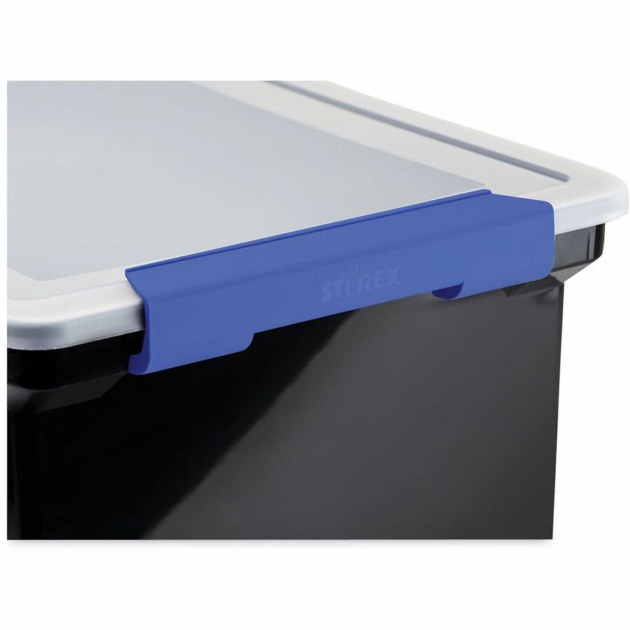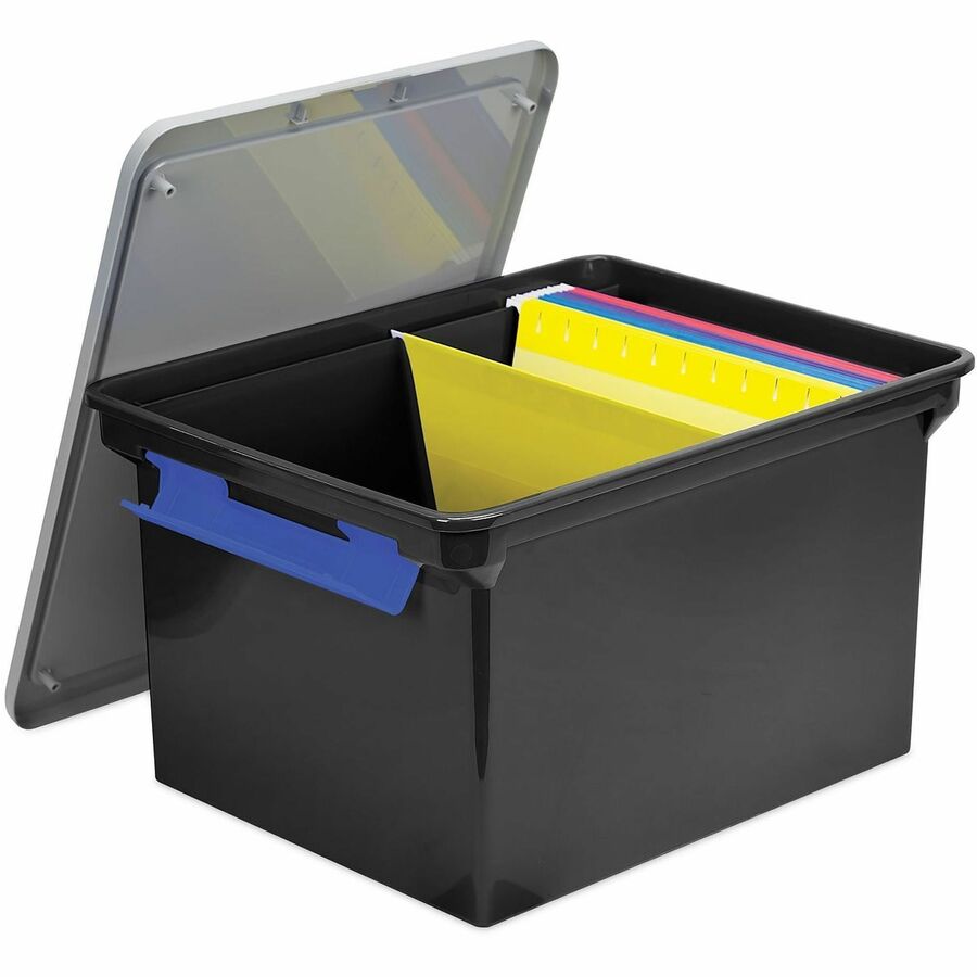 Tote storage box lets you conveniently organize your legal-size and letter-size documents in a portable design. Storage compartment offers quick access to your files and documents. Locking handles secure the lid in place. Comfort grips make transportation easy and painless. |