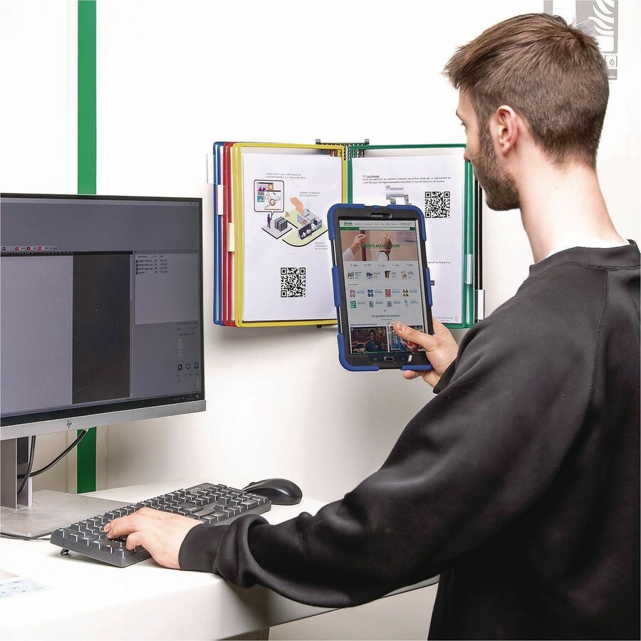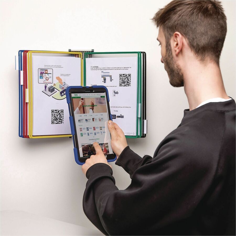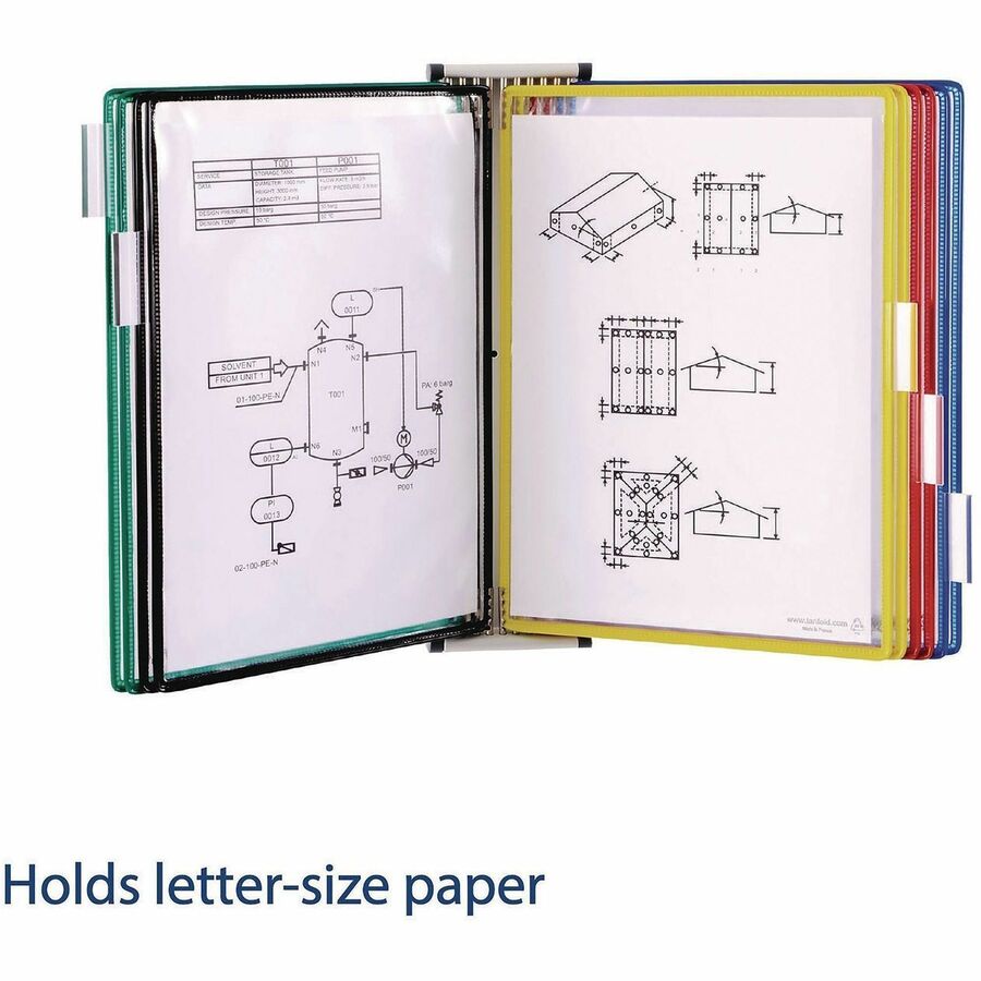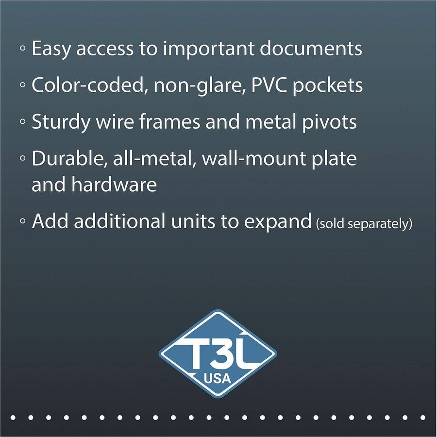 Wall Expansion Set is designed for use in the Tarifold Wall Unit Organizer and Partition Wall Bracket Starter Set and includes 10 PVC pockets in assorted frame colors, mounting plate, index tabs, pluggers and hardware. Letter-size, pivoting pockets are designed for optimum visibility. They offer strong protection for your documents against dirt, spills and dust, even with intensive use. Wire-reinforced, display pockets are rigid but flexible enough to insert and remove documents easily. Vertical mounting allows quick eye-level reading. |