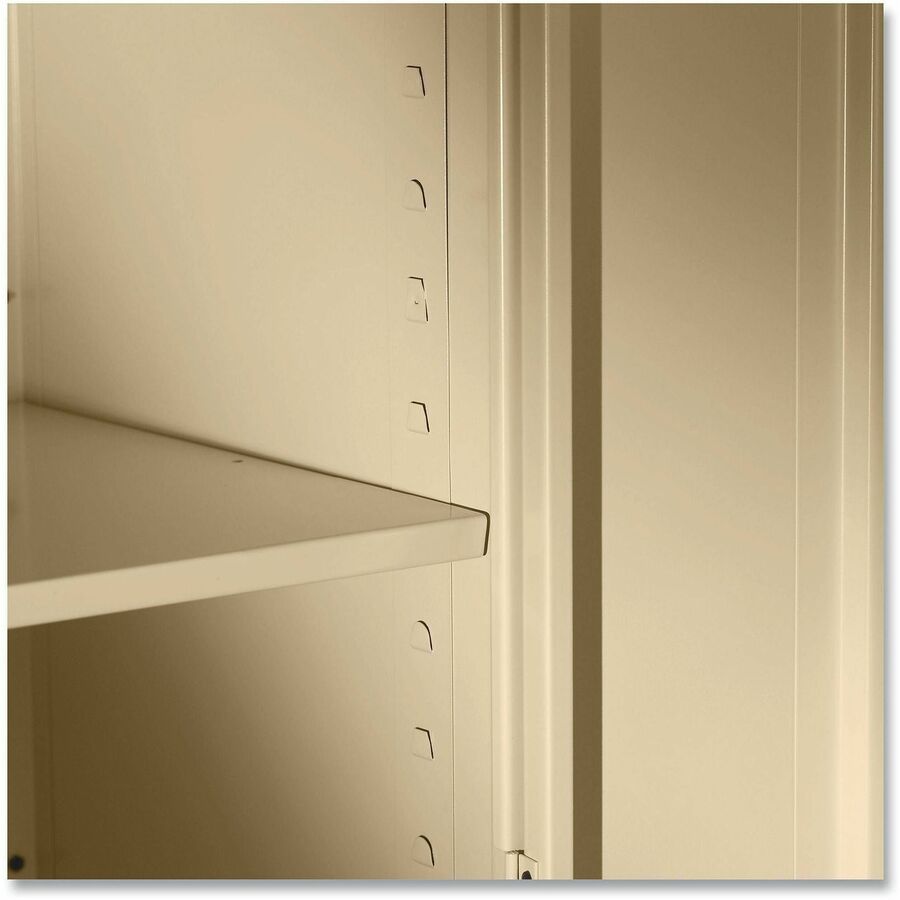 This deluxe cabinet features a heavy-gauge steel, 16-gauge door frame for rugged storage and use. Louvered back panel provides cabinet ventilation by allowing air circulation. Four of the five shelves adjust in 2" increments without tools. Built-in shelf support tabs secure shelves tightly to cabinet without clips or added parts, adding rigidity and preventing small items from falling over edge or rear of shelf. Each door incorporates an extra-wide reinforcement welded for added strength and stability. Four knuckle-hinges offer secure and smooth operation. Two brushed chrome handles, with one that locks both doors, make door opening and closing easy. With three-point locking mechanism, you can simply turn the handle, and doors lock at three points for maximum security. Nylon guides help make operation quiet. Raised base uses a box construction for added overall stiffness and keeps materials out of harm's way from cleaning liquids. Two adjustable levelers compensate for uneven floors. |
