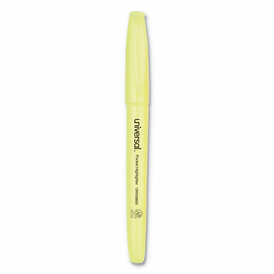 | Marketing Information | Universal™ Pocket Highlighters are well-designed highlighting pens that feature bright, vibrant colors. The chisel tip allows for both broad and narrow lines. Long cap with pocket clip holds firmly on either end of the highlighter so it doesn't get lost. The bright ink stands out on the page and dries quickly. Enjoy effortless highlighting with a slender barrel that's comfortable and easy to hold. |