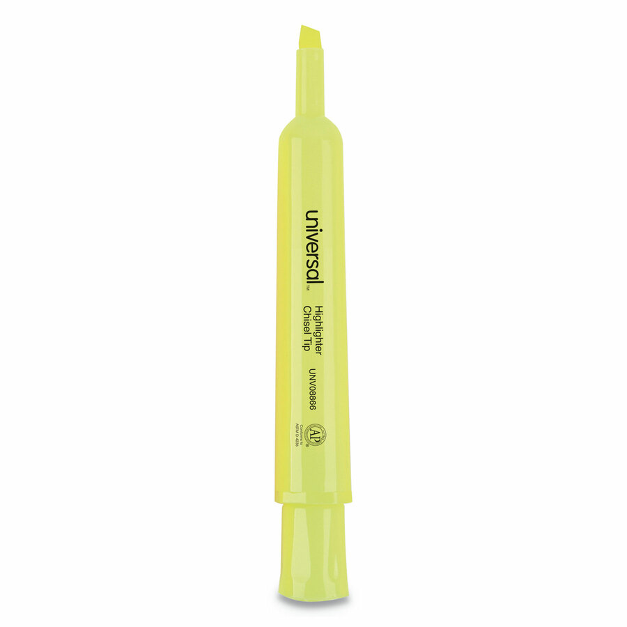 | Marketing Information | Universal™ Desk Highlighters are well-designed highlighting pens that feature bright, vibrant colors. The chisel tip allows for both broad and narrow lines. Large cap holds firmly on either end of the highlighter so it doesn't get lost. The bright ink stands out on the page, dries quickly, and will not fade. Enjoy effortless highlighting with a smooth barrel that's easy to hold. |