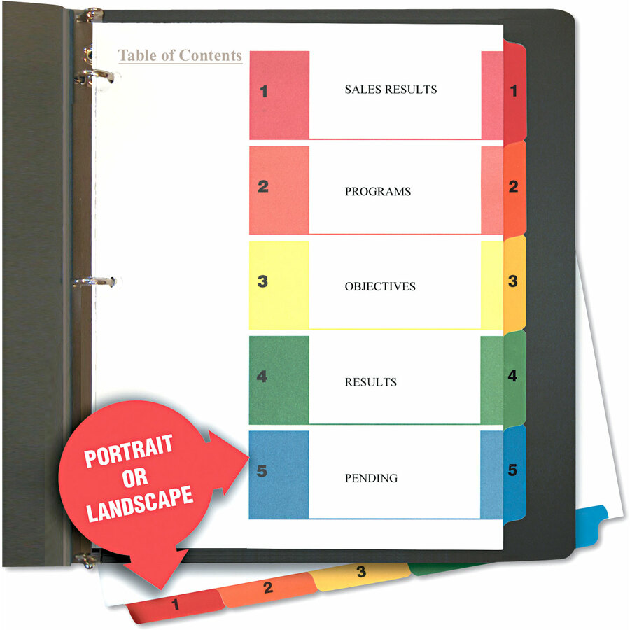 | Marketing Information | Organize your proposals, notes, reports, and files with professionally printed Table of Contents dividers. Simply print your selection titles on the Table of Contents page using your laser or inkjet printer. The three-hole punched white dividers feature multicolor laminated tabs and a Mylar® reinforced binding edge. Built with enhanced durability to prevent tear out. The built-in holes eliminate the need for a hole punch and ensure the tabs line up perfectly. Adaptable to both portrait and landscape orientations. |