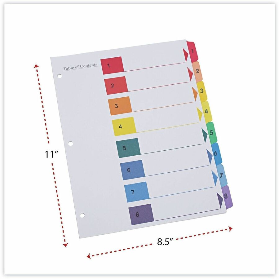 8 Printed Side Tab(s) - Digit - 1-8, Table of Contents - 8.5" Divider Width x 11" Divider Length - Letter - 3 Hole Punched - White Paper Divider - Assorted Paper Tab(s) - 30% Recycled - Double-sided, Mylar Reinforced Edge, Laminated Tab - 6 / Set