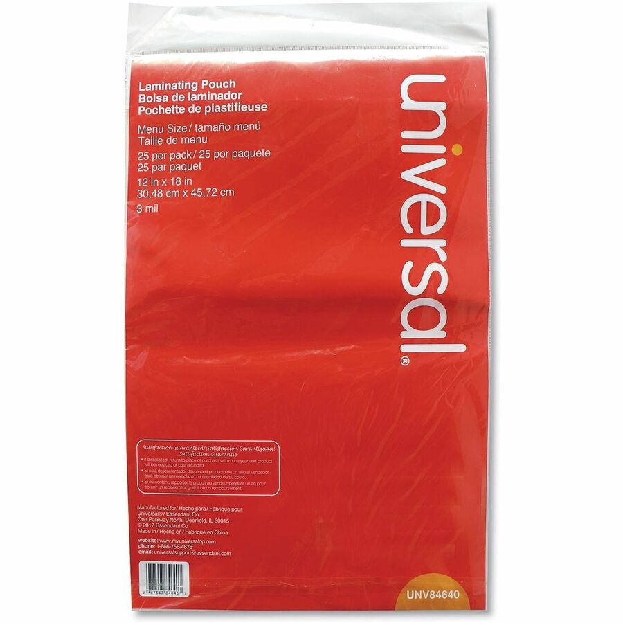 Sheet Size Supported: Menu 18" Width x 12" Length - Laminating Pouch/Sheet Size: 18" Width x 3 mil Thickness - Matte - for Document, Sign, ID Card, Photo, Tag, Menu - Temperature Resistant, Liquid Resistant - Clear - Plastic - 25 / Pack