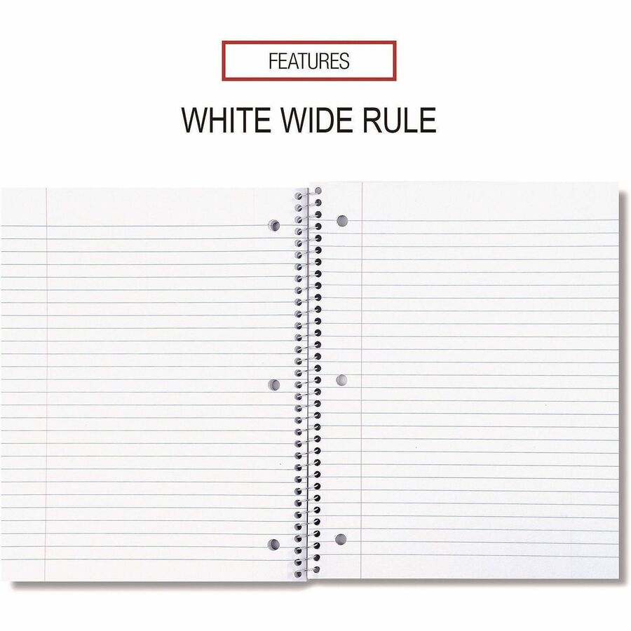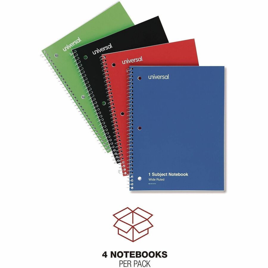 1 Subject(s) - 70 Sheets - Spiral - Wide Ruled, Legal Ruled Front Ruling - 3 Hole(s) - 15 lb Basis Weight - 10.50" Height x 8" Width - White Paper - Black Paperboard, Blue, Green, Red Cover - 4 / Pack
